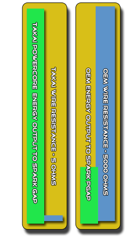 TaKAI uses the latest cutting edge technology we call "CORE" tech using a unique hybrid winding designed for outstanding conducting characteristics. It is designed to harness the electrical and magnetic energy passing through the wire and convert it back into potential energy at the spark gap. Using induction, TaKAI's wire construction al lows for maximum energy transfer and releases energy reserves when the spark gap requires more input energy. When other companies use capacitors, TaKAI uses inductors to promote high forward voltage at the spark gap. This allows for maximum energy transfer to the spark plug, helps sustain spark energy over a wider period of time and allows for more reliable ignition events vs competitor products.
